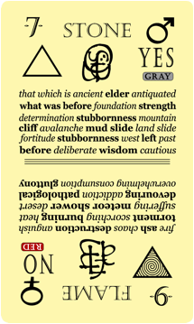 Right away, you'll likely notice the card faces are almost entirely textual (whereas classic Tarot employs mostly esoteric symbols and imagery). This is deliberate. Foremost, the deck is a wordsmith's tool, so what better means to channel and inspire than with words? Also, "reading" here is an associative exercise, where card content ultimately triggers creative textual output. Sometimes that output is inspired by the cards (derived from associative chain-reactions in the writer's mind), but it can also be copied directly off a card face if the reader feels that best suits a particular query. In short, words are the active ingredient.