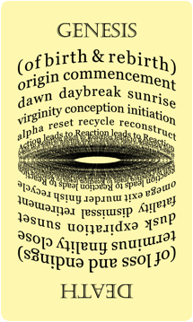 Element is the most complex and mystical suit. It represents the timeless whole of our experience across all three realms (Body, Mind, and Spirit). And this is divided into 27 elemental domains, each domain infused with its own spiritual (creative) energy and influence. Of course 1/27th of EVERYTHING can't be printed on a single card, so each panel (two per card) acts as ambassador for it's particular elemental domain, presenting key words, terms, numbers, and symbols which best reflect the nature of that elemental domain. Each Element resides in one of the three realms. And all have the usual binary facets (male/female, good/evil, positive/negative, yes/no, etc.), so every Element appears twice in this deck.